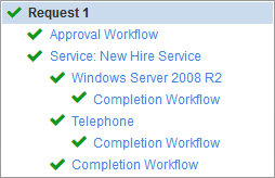 Once the request has been approved, a checkmark appears next to the approval workflow. The VM component is now ready for deployment, so green arrows indicate that some attention is required. At this point, you could deploy at either the Service level or the Component level of the tree. The clock next to the custom component indicates that it has moved directly to the completion workflow stage.